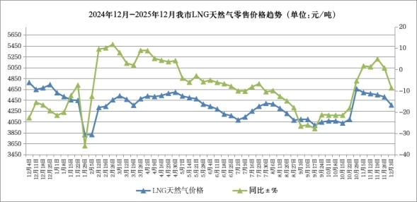 呼和浩特市價格認證監測中心對市場監測數據顯示,本周我市LNG天然氣零售價格為4360元/噸,比上周下降150元/噸,降幅3.33%,同比下降8.71%。