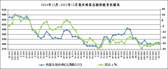 本周我市雞蛋出場價格為315.00元/50公斤(3.15元/斤),與上周持平,同比下降33.22%。