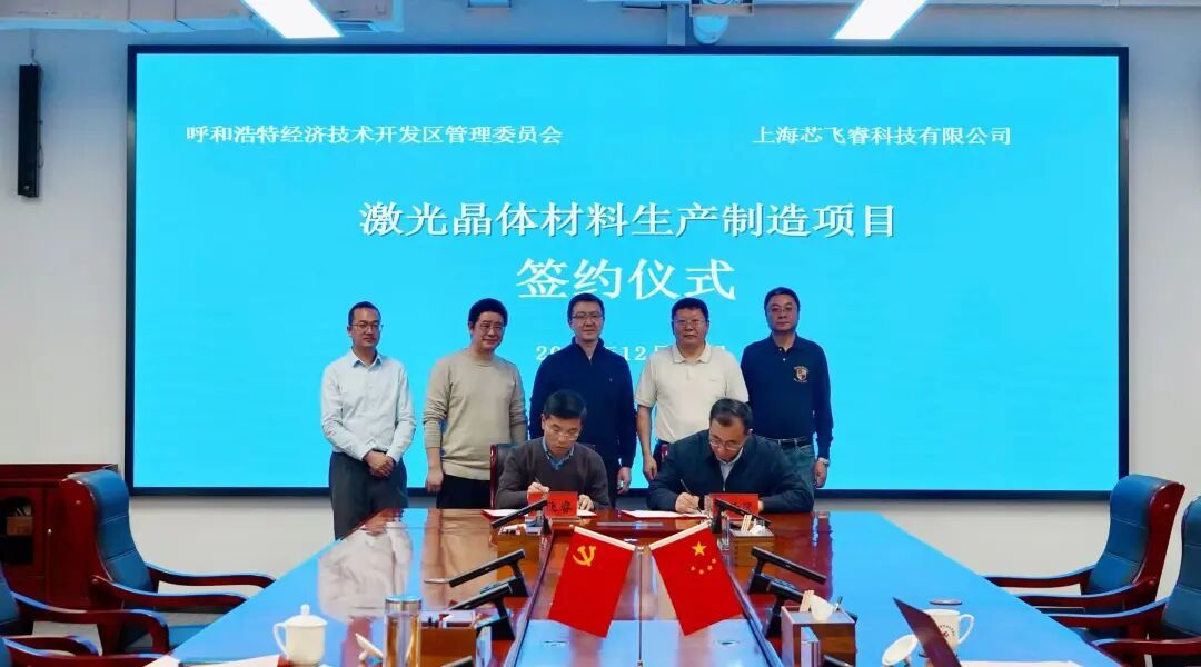 經開區黨工委委員、管委會副主任蘭常青與上海芯飛睿科技有限公司董事長兼總經理董永軍簽署《激光晶體材料生產制造項目投資合作協議書》。