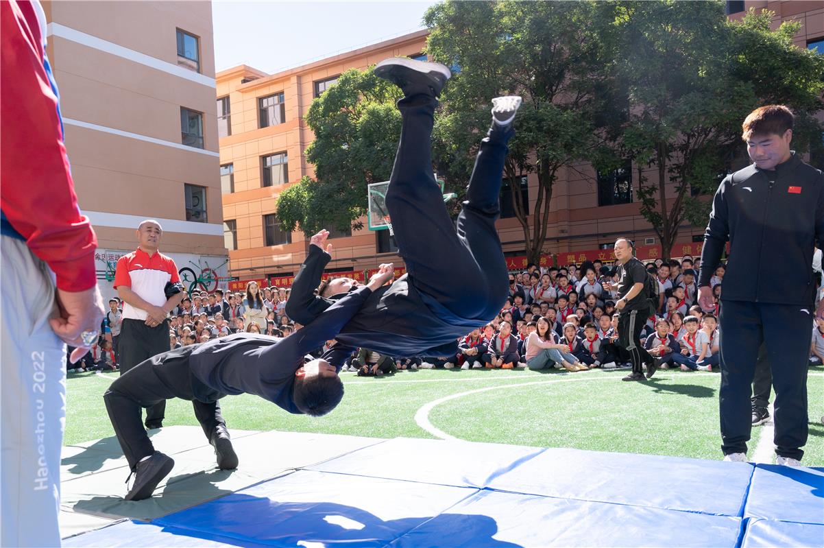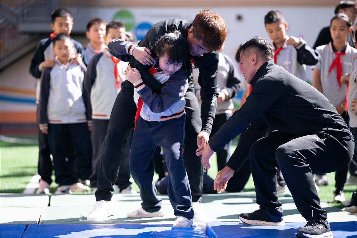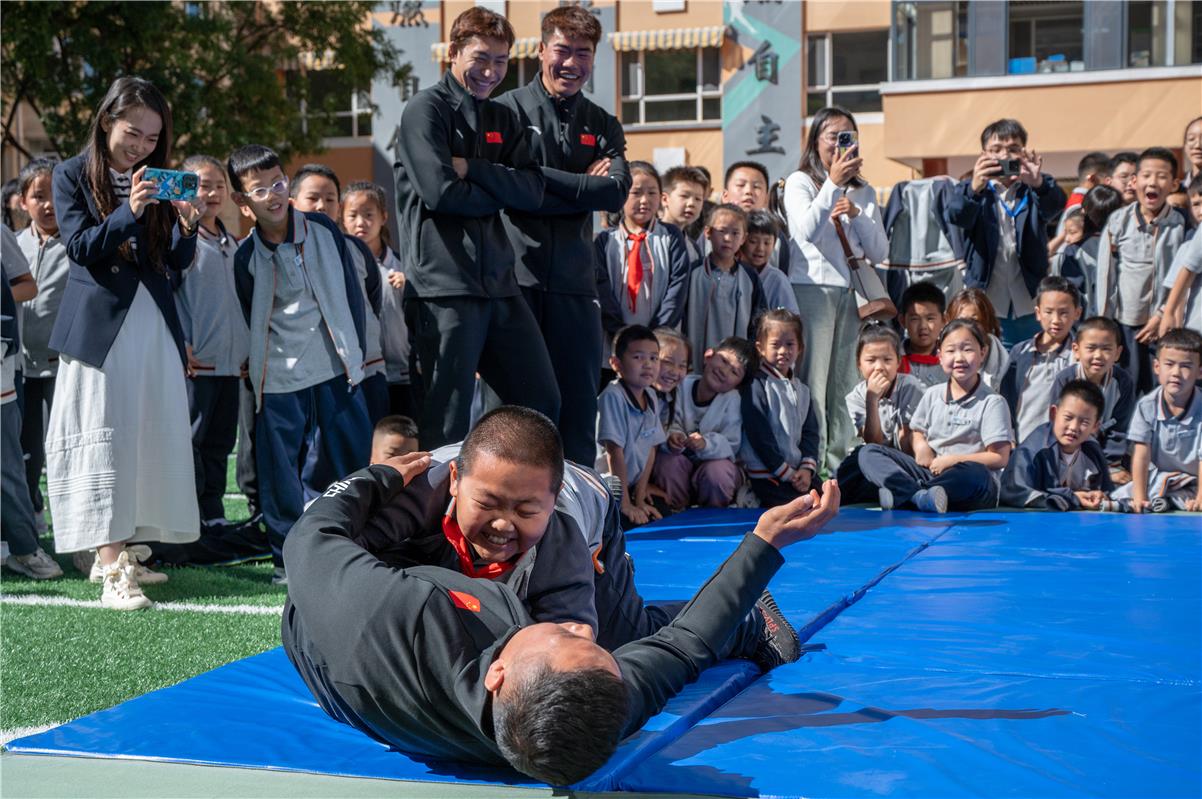 小學(xué)生在運(yùn)動(dòng)員的指導(dǎo)下練習(xí)摔跤。