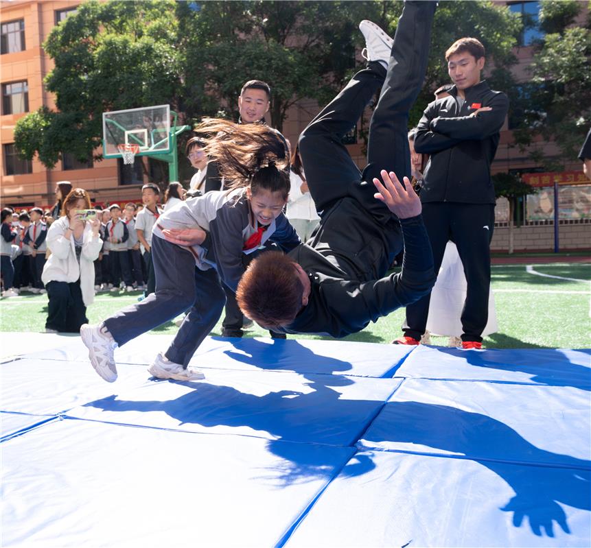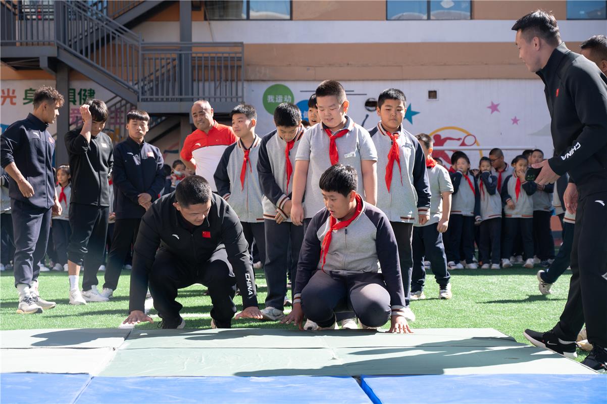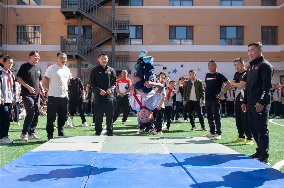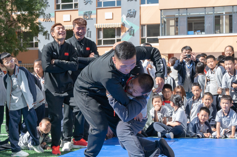 活動(dòng)中,內(nèi)蒙古重競(jìng)技運(yùn)動(dòng)管理中心的工作人員、摔跤項(xiàng)目運(yùn)動(dòng)員與學(xué)校師生親密互動(dòng),帶領(lǐng)學(xué)生體驗(yàn)摔跤運(yùn)動(dòng),感受摔跤運(yùn)動(dòng)魅力。本次揭牌的少年摔跤訓(xùn)練基地,是該校推進(jìn)體育文化與特色課程的一次深度融合,為學(xué)生搭建與專業(yè)體育項(xiàng)目交流平臺(tái),推動(dòng)體育精神在校園傳承與發(fā)揚(yáng)。