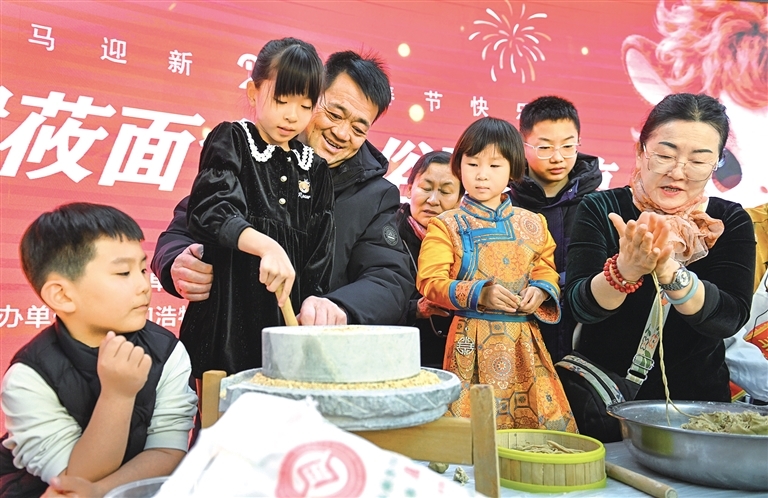 2月26日,在呼和浩特市圖書館,人們體驗石磨加工莜麥面。農歷正月初十,俗稱“石頭節”或“老鼠娶親日”。這一天,在北方部分地區素有吃莜面的傳統民俗。呼和浩特市圖書館舉辦“圖書館莜面會·年俗玩不停”傳統手工莜面非遺體驗活動,特邀莜面制作技藝內蒙古自治區級非遺代表性傳承人現場傳授技藝,讓人們在親手實踐中感受中華優秀傳統文化的獨特魅力。