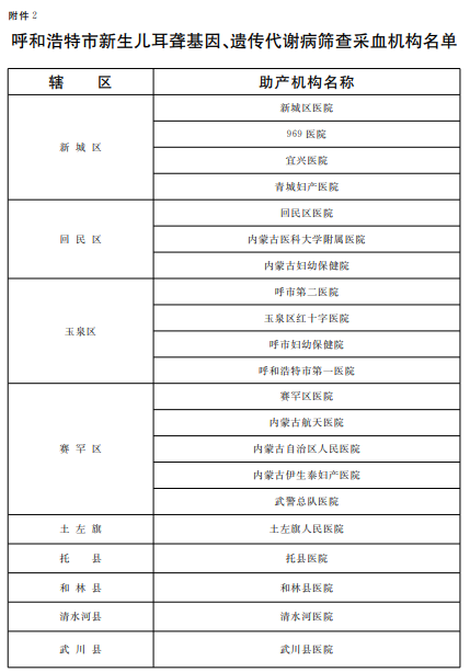 2.呼和浩特市新生兒耳聾基因、遺傳代謝病篩查采血機(jī)構(gòu)名單