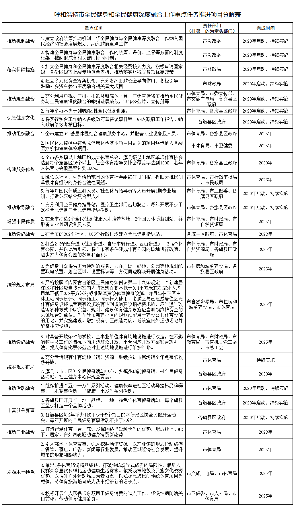 附件:呼和浩特市全民健身和全民健康深度融合工作重點任務推進項目分解表