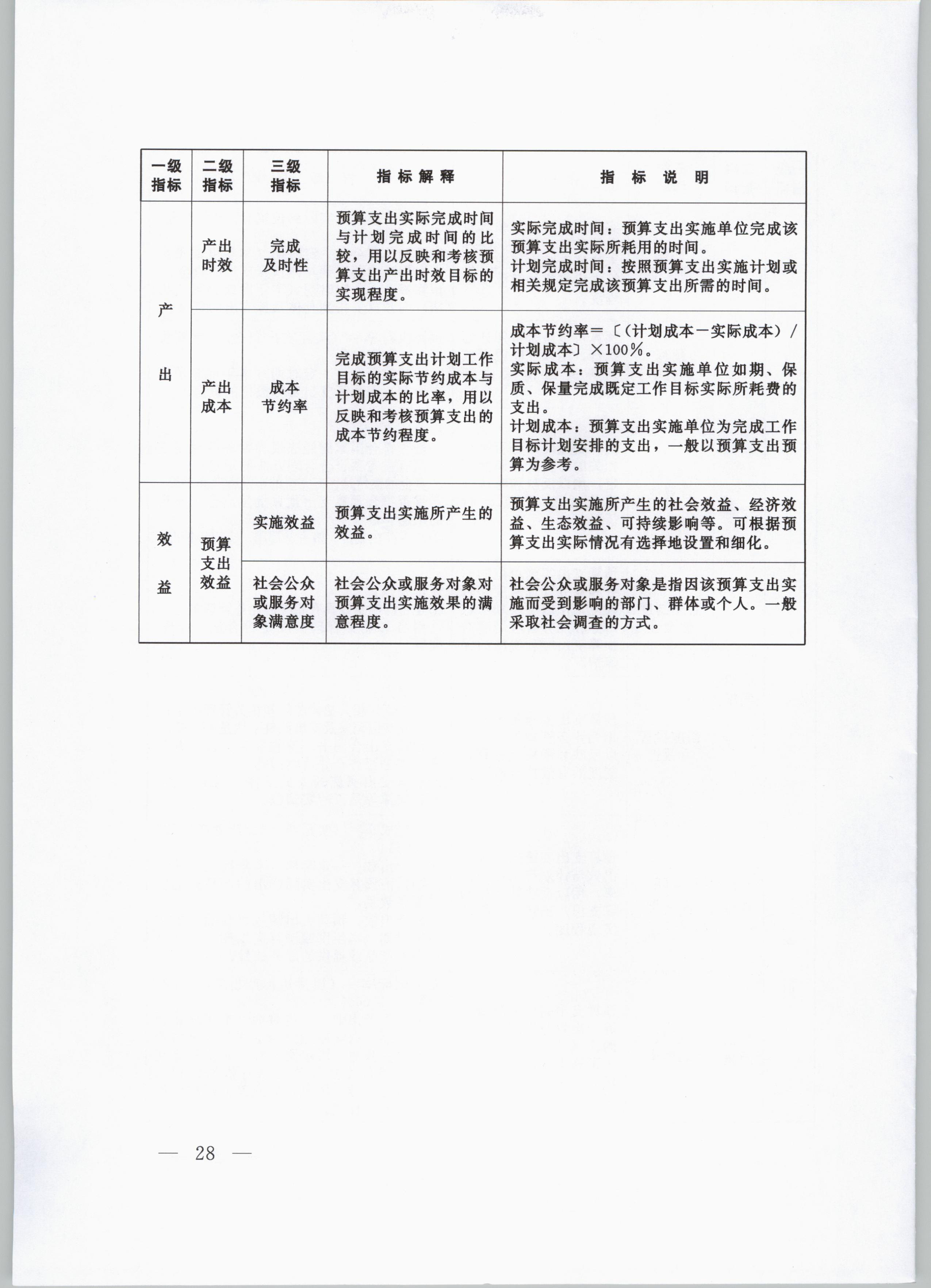 (一)產出指標。反映根據既定績效目標完成的公共產品和服務情況。產出指標可細化為:數量指標,反映根據既定績效目標完成的公共產品和服務數量;質量指標,反映提供公共產品或服務達到的標準、水平和效果;時效指標,反映提供公共產品或服務的及時程度和效率情況;成本指標,反映提供公共產品或服務所需用的成本,分為單位成本和總成本。