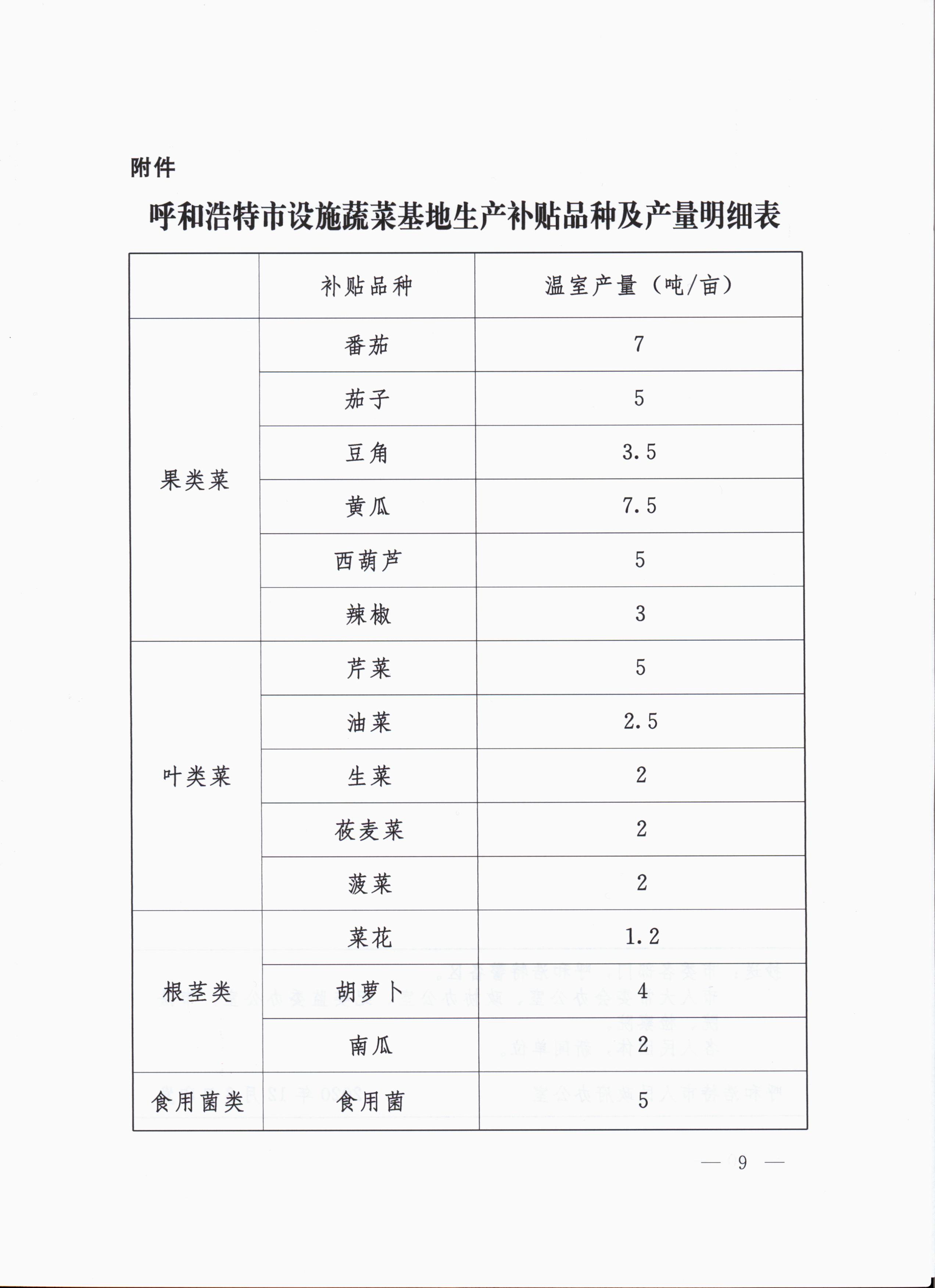 設(shè)施蔬菜基地種植補貼品種為果類菜中的番茄、茄子、豆角、黃瓜、西葫蘆、辣椒6種;葉類菜中的芹菜、油菜、生菜、油麥菜、菠菜5種;根莖類中的菜花、蘿卜、南瓜3種;食用菌類,共計15種蔬菜品種。申請補貼的蔬菜產(chǎn)量要達到產(chǎn)量要求。(見附件《呼和浩特市設(shè)施蔬菜基地生產(chǎn)補貼品種及產(chǎn)量明細表》)