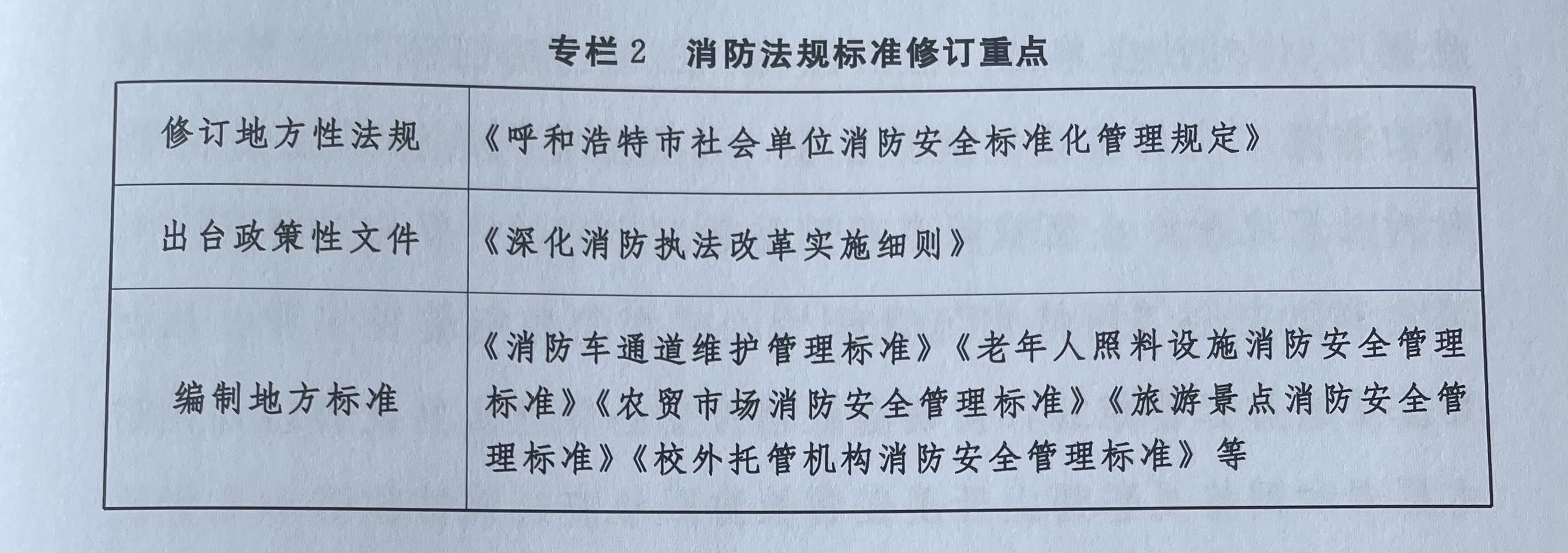 加強消防法制保障。結合消防機構改革轉隸和消防執法改革,清理、修改、完善與消防救援事業發展不適應的地方規章、行政規范性文件;制定出臺《深化消防執法改革實施細則》;持續推進行業消防安全標準化管理,相關部門聯合制定出臺行業消防安全管理規章,緊盯重點領域、重點行業,制定出臺消防地方標準;加強新頒布實施消防法律法規的宣傳貫徹工作,建立各級人大對“一法一條例”執法工作的監督評估機制,為推動消防工作高質量發展提供法律支撐和保障。