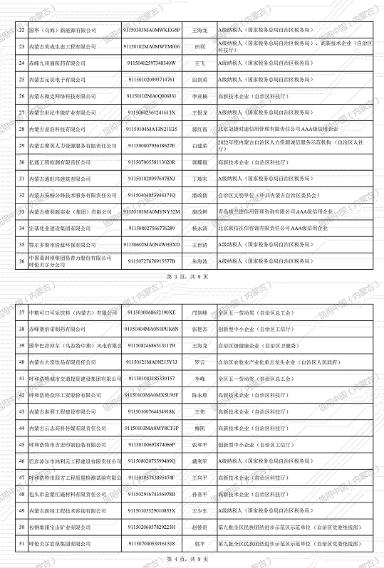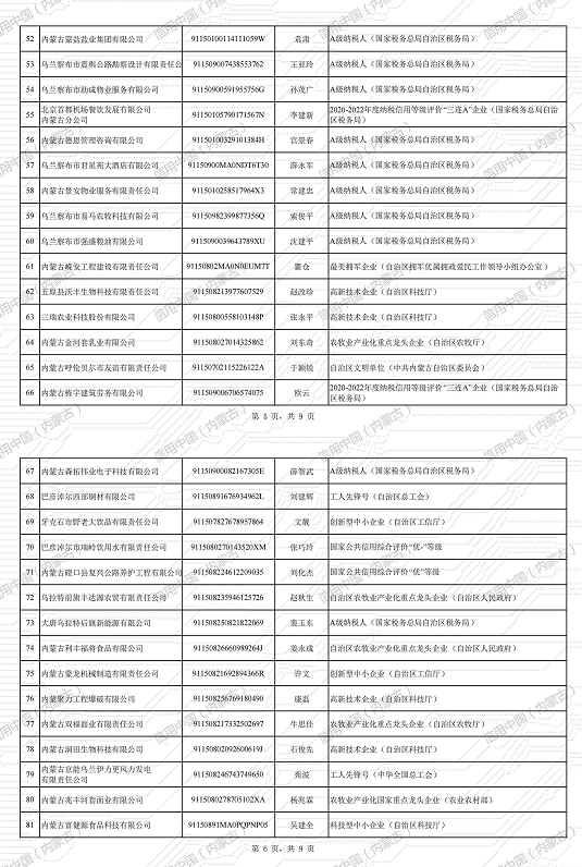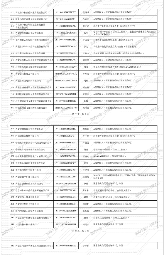 為貫徹落實《內蒙古自治區人民政府辦公廳關于印發〈內蒙古自治區誠信典型選樹實施辦法(試行)〉的通知》(內政辦發〔2018〕69號)要求,根據《內蒙古自治區發展和改革委員會關于印發〈內蒙古自治區誠信典型企業選樹管理辦法〉的通知》(內發改委財金字〔2023〕1032號),經自治區各行業主管部門和各盟市社會信用體系建設牽頭單位推薦,企業自愿申報,我委嚴格審核,確定3家企業為2024年第一批自治區誠信標桿企業、112家企業為自治區誠信示范企業,現予以公示。公示期為20個工作日(2024年1月22日-2024年2月21日)。如有異議,請在公示期內向我委財政金融和信用建設處反饋。經公示無異議后,最終名單將通過“信用中國(內蒙古)”網站向社會公布。